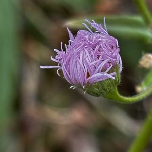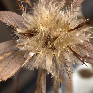 ③秋に径約2cmのアザミに似た 筒状花 雌雄異株(2025・9/25) 総苞の周りにある魚の骨の ような苞葉が特徴です。 ①②果実は痩果で 暗褐色 果実には伏毛が上向きに密生する そう果よりも長い長さの そろった冠毛が多数つき 淡褐色で羽毛状 果実時期も独特な苞葉がある (自宅の鉢植え🪴) 朮(おけら) キク科