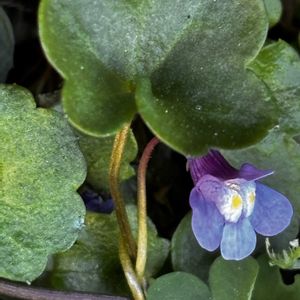 🌱💙💜野に咲く花💜💙🌱 (道端のブロック塀) 花は小さく約8mm 唇形花 花の後部には短い距(きょ)がある。 葉っぱは手を広げたような形 つるでどんどん伸びます🎶 蔦葉海蘭(つたばうんらん) オオバコ科