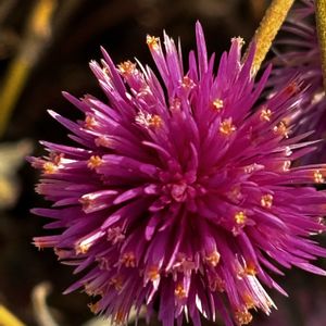 🌱🩷畑の花🩷🌱 普通の丸い花とは違い〰︎ ピンク色の花びらのような部分は 苞(ほう)で その先端から 飛び出すような小さな黄色い部分 が 本当の花です💛 千日紅(せんにちこう) 別名 千日草 ヒユ科