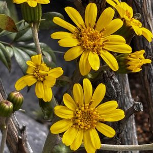 💛黄色の花💛 ①②③石蕗(つわぶき)キク科 晩秋から初冬にかけて開花 直径約5cm前後 昔から 民間薬や食用野菜として使用 ④⑤木立朝鮮朝顔 ナス科 別名 エンジェルトランペット 春から秋にかけて下向きに 垂れ下がった花を付ける 花弁の先端は 5つに分かれ 反り返る🎶 全草有毒植物