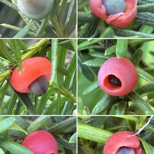 🌲🔴秋に赤く熟す実🔴🌲 ①一位(いちい) イチイ科 約1cmほどの「仮種皮」と 呼ばれる果肉でほんのり甘い🔴 しかし中心にある「種子」には 強い毒が含まれる💦 🔴北の国では「オンコ」と呼ぶ ②③④山法師(やまぼうし) ミズキ科 果実は甘味があり 生食できる直径約2cmの集合果 ⑤花水木の果実 ミズキ科 約1cmの赤く光沢のある楕円形