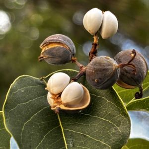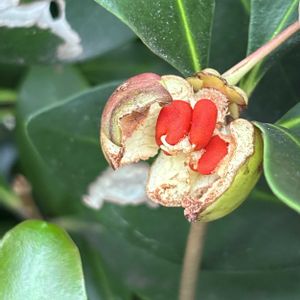 直径15mmほどの球形で 秋に赤褐色に熟すと〰︎ 肉質の果皮が不規則に裂け❣️ 1~4粒の赤い種子がこぼれ落ちる 🎶野鳥が食べにきます🎶 木斛(もっこく) サカキ科 別名 アカミノキ アカモモ