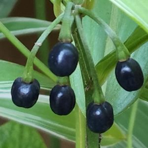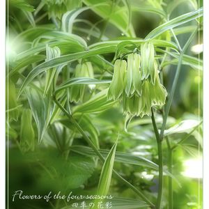 斑入りホウチャクソウ (斑入り宝鐸草) イヌサフラン科 花期: 5-6月の初夏 林内に生える多年草。 茎の高さ30~50㎝。 上部で枝分れし、枝先に花が1~3個垂れ下がる様子が、寺院などの軒下の宝ちゃくに似ることからこの名がある。 上部で分岐した枝先に、長さ2 cmほどの細長い筒状の花が1 - 3個垂れ下がって咲く。 花被片は6枚(3枚の花びらと3枚のガク)で合着しないが、チゴユリのようには開かないので筒状に見える。散る時はバラバラに散る。 花の先端ほど緑色が濃い。 花の後には直径1cmほどの実がなり黒紫色の液果となる。 ③は出来立ての緑色の実。雌蕊は一つで長く伸びた先が三つに割れる。 ④は春先の新芽🌱プックリとして可愛い。