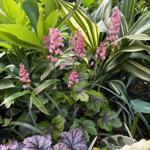 裏庭にも次々と花が咲いてきました😊 ① ヒューケレラ ピンクレボリューション🩷 ヒューケレラとティアレアの交配種! ② ティアレア ③ 斑入り ホウチャクソウ 花後は青黒い実を着けます☺️