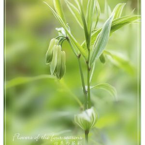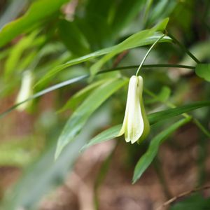 ホウチャクソウ ユリ科 アマドコロによく似ています。 茎は円柱形。上部で枝分かれし、 葉腋に花が3~5コつきます。