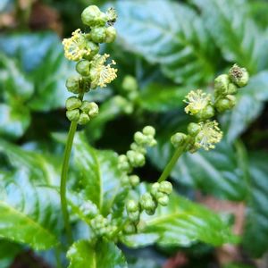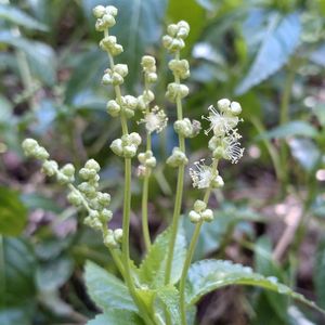 ヤマアイ[山藍] トウダイグサ科ヤマアイ属 本州~沖縄の涼しい日陰に自生する染料植物で、デアイが青に染まるのに比べ、青みがかった緑色に染まる これは雄花です
