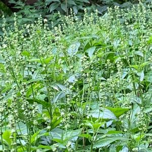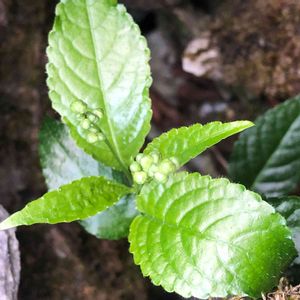 ヤマアイ(山藍) トウダイグサ科ヤマアイ属の多年草 雌雄異株ときに同株 雨に濡れているわけでもないのに、ツヤツヤテカテカ✨の葉っぱが、林に群生していました。 花火🎇のような小さな花が咲き始めていました。 雄しべが多数ついた雄花ばかりに気をとられ、もっと地味な雌花を見過ごしてしまいました(*・∀;)