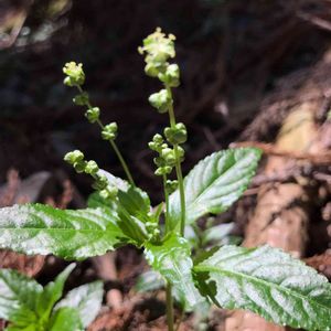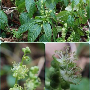 3/4 角田山 ② ヤマアイ(山藍) トウダイグサ科ヤマアイ属の多年草 地味な娘、誰もカメラなんて、向けないだろうナ〜。何年振りかナ〜。藍染の藍です。 ✌️✌️✌️😃😃😃✌️✌️✌️ チョット変な娘なんだネ。『図鑑によって雌雄異株、雌雄同株と異なりますが、「雌雄異株ときに同株」(日本野生植物館)が正解のようです』だって。 ⬆️は全体↙️↘️は雄花です。雌雄同株の場合『雌花序は茎の上部の葉腋に1つずつ付き、短く、雄花序はその下の葉腋に1つずつ付き、雌花序よりも上まで伸びます』とあります。 ⬆️の写真の葉の付け根を拡大すると、雌花らしき物が・・・良くワカリマセ〜ン。もっと良く観察してくれば良かったナ〜。 💦💦💦🙇♂️🙇♂️🙇♂️💦💦💦 GSで検索したら9枚の投稿がありました。