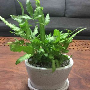 プテリス 育ている葉の形と鉢に一目惚れ。 連れて帰って来ました(*´∇`*) 南向きのお部屋のリビングで一緒に暮らします