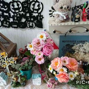 庭の薔薇を摘んで玄関に飾りました🌹 アナベル漂白剤で白くしてみました💮💮💮 ダッフィーの横に置いています◡̈*✧ 薔薇をドライフラワーにしたのをアナベルとコラボ しようと思っています💓スワッグと籠盛りに✧*。しよう かしら