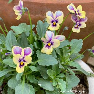 神戸ビオラ、べっぴんさんの寄せ植えです😊 紫に黄色の入り方が可愛いくて😊 上の花びらが3枚なのも好きです😍🌸 アリッサムや白いブラキカム、ヘリクリサムなどが見えてます😊🌸 小さなお花は、撮るのが難しくて、なかなかうまく撮れないですが😅 明日は穏やかな良い一日になりますように🍀