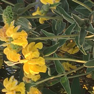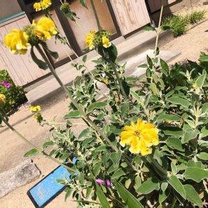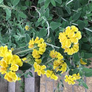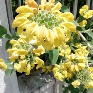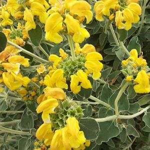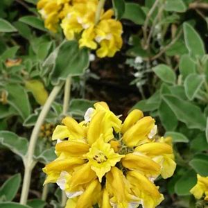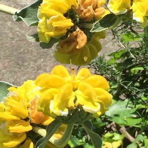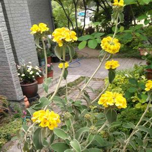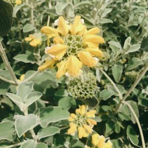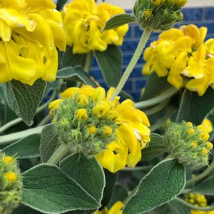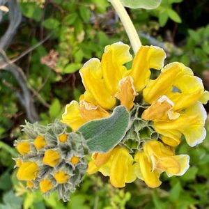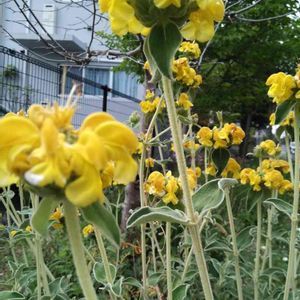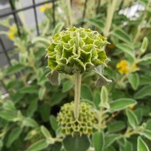 🌼エルサレムセージ シソ科 フロミス属 葉はセージのようで芳香があり、楕円形でしわがあり、やや灰色がかった緑色で裏側は白、葉は毛に覆われている 明るい黄色の筒状花は3cm程の長さで、夏頃に短い穂状て螺旋状に着くそうです