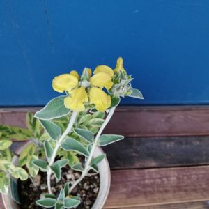 セージと名の付くものを見かけると全て試してみたくなる。 花が咲いているのがエルサレムセージ 株元の斑入りはコモンセージの一種ゴールデンセージ。