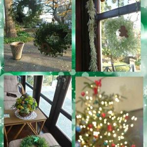 12/22(土)⑭ 横浜 山手西洋館 世界のクリスマス2018 ブラフ18番館 緑色の毛糸の玉?の上にはこんな白い枝と花と緑のディスプレイがありました。 不思議な飾り付けですねー。 (*´・ω・`)b