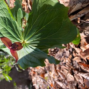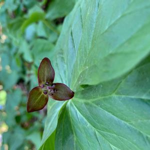 コチャルメルソウ(上)✿✿ 花言葉『謙遜』 ここに咲いてるよ❣️と知らなければ見落としてしまうほど、小さくて目立たない花です。 チャルメルソウとは、果実が熟して開いた様子が、楽器のチャルメラに似ていることから命名された。 チャルメルソウ属というのは、全世界に20種ほど知られているが、そのうち10種類が日本固有種とのこと。 花弁は5個あり、紅紫色または淡黄緑色で、長さは4mmになり羽状に細く7-9裂して「魚の骨」状になり、外面に腺点があり、花時には反曲する。 エンレイソウ(下)✿✿ 花言葉『奥ゆかしい美しさ』『落ち着いた美しさ』 太い地下茎から20cmほどの茎を伸ばし、3枚の大きな菱形の葉を輪生させ、その中心から1輪、暗紫色で径2~3cmの花をつける。 3枚の外花被片は茶色から緑色までの変化があり、地味ながら渋みを感じる。 延齢草と書き、縁起がよさそうどが、語源についてはよくわかっていない。