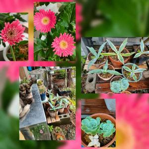 今日のお花💕 & 今日のお庭💞 エケベリア アガベ(明日)😁 ←ちびさん🐆☔の日はこの場所がお気に入り😸 ←newのガーベラ咲きました🤗 ↑前からあるガーベラに似てた😅