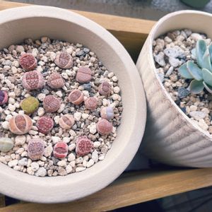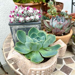 ベランダ庭より 昨日と違っていいお天気☀️.° 少しだけ...植え替え 七福神が親株含めて7つに増えて育ったので... 少し大きな鉢に❁⃘*𓂃𓈒𓂂𓏸 下茎のチビ達はモギモギして~in