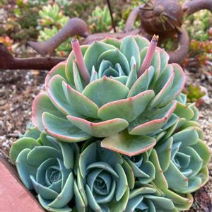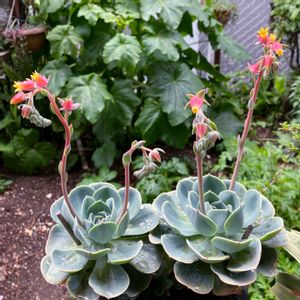 七福神 花芽をあげてきましたね 七福神の花の色は鮮やかで きれいですね エケベリアに花が咲く事をしらない 通りすがりの方が「あらこれ花も咲くの?」なんて話ながらお散歩してるのを 耳にします エケベリア自体が花みたいですものね! 雨づづきで多肉達が心配になりますね