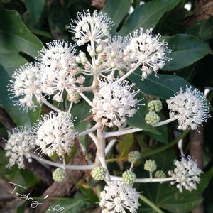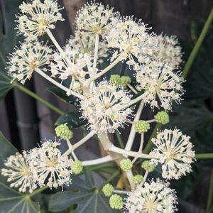今日のお花 ܾ ܾ 𖥧𓇣 ܾ ܾ ܾܾヤツデ ܾ ܾܾ ܾ 𓇣 𖥧 ܾ ܾ 八手 別名 テングノハウチワ 👺天狗の羽団扇👺 オニノユビ(鬼の指) ハッカクキンバン (八角金盤) ウコギ科 ヤツデ属