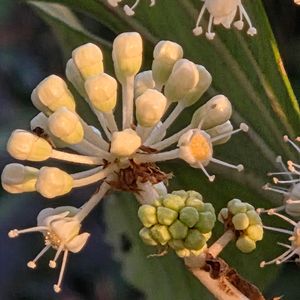 ☘️ ヤツデの花 ☘️ おはようございます♪ 今年もヤツデの花が咲きました♪ まん丸で放射状に広がる花は 独特で綺麗です🎶 寒さのせいか例年たくさん やって来る花アブやミツバチ はやって来ません🐝🐝🐝 今日も穏やかな一日に なりますように🎶