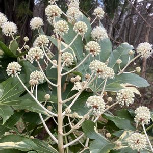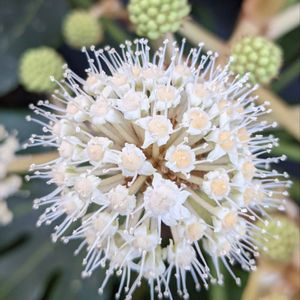 八つ手🌳 ヤツデ よそ様の生垣 蕊がぴょんぴょんしてかわいい〜球体♡♡ 幼い頃、お隣のえみちゃん家の玄関前にもあった懐かしい植物です。 やがて黒い実になり、ままごと遊びでよく遊んだ、、大昔。 丸くて⚫️黒い実‥毒は有りません。葉や茎、根などは危ないそうですが🤗