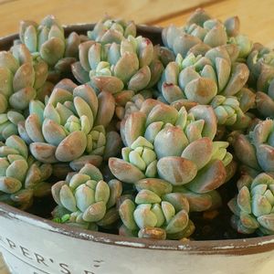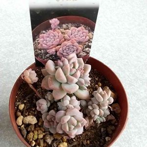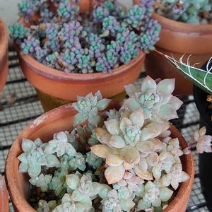 我が家のスノーキャンディさんです😊 ほんのりピンクがかって可愛い💕 名前からして冬に強いのかな?❄️ と思って… 小屋で頑張ってます。 周りにプロリフェラ、ブロンズ姫、秀麗などの子株が少し。 春になってグンと伸びるといいな。🎶