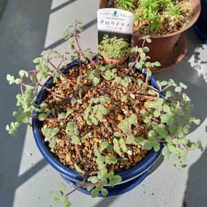 ブロウメアナ?ポーチュラカリア? 妹にもらった多肉なんですが、妹も「名前なんだったかな〜?」って感じで正体不明の多肉さん。 ネットで調べて、ブロウメアナかポーチュラカリアアフラというのに似てるなと思っています。 妹によると「かわいい花が咲くんよ〜」とのこと。 妹は園芸店で働いているのですが多肉植物は流通名が色々だったりするからよくわからないことも多いとか。 名前わからなくてもいいけど、育て方とか注意点とか調べたい時はちょっと困る(^_^;)