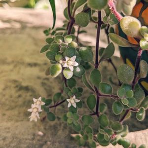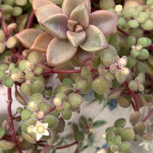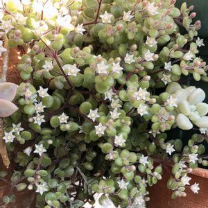 気付いたら、、、咲いてました。 白くて小っちゃいお花🤍 直径 3㍉くらい💕 丸葉万年草かな?! 可愛いです。 でもよくよく見たら、宙に浮いてました。 根っ子が土に埋まってない💦 多肉は強いですね😅 ※ゆずちゃんより、ブロウメアナと教えてもらいました🥰