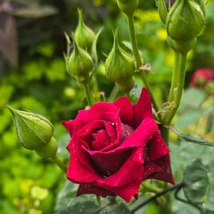 今朝庭 そろそろ花殻とりが始まりそうです 淡い色合いの多い我が家のバラたちの中でオデュッセイアの赤が目を惹きます 欲を言えばもう少し咲いて欲しい、、