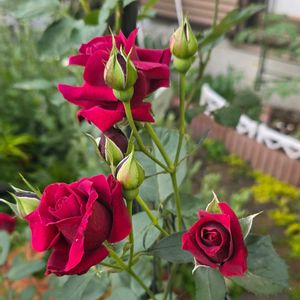 バラも次々咲いていますが、花壇なので、雨にまともに当たってしまいます💦 咲いては切る作業が続いています😅 フェンス沿いに咲いた オデュッセイア🌹 秋まで良く咲いてくれる優秀なバラ、フェンス沿いに広げてみようと誘引中です(^_−)−☆💕