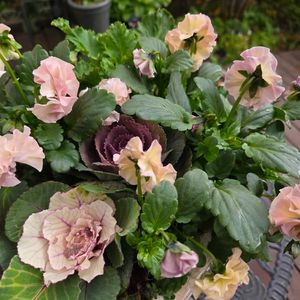 寄せ植え *フリルパンジー・リズ* フリルパンジー・リズが優しく咲き出しました。 似た色のハボタンと後方にウィンティ(ブルーピコティ)を植え込みました。🩷💜💚