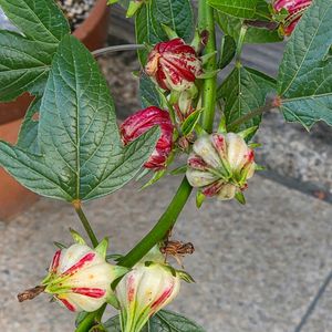*ローゼル* 散歩道、赤白混合の可愛いローゼルに会いました。 うちのは、赤ばかりなので珍しかったです。