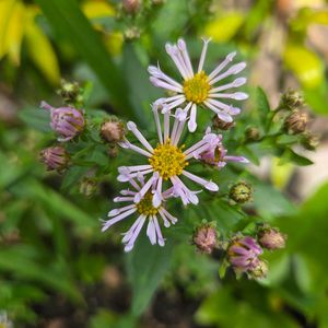 *ノコンギク* オビトケノコンギクが、スプーン状のお花を咲かせてくれました。 3️⃣枚目、シロタエギクの葉の中から、下から伸びてきたノコンギクが一緒に植えたように、可愛く咲いています。💜