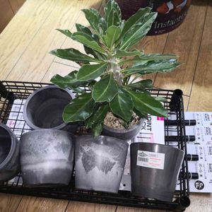 実は…春にお迎えしたパキポの恵比寿笑いが根腐れし、昨日完全に☆になりました。 葉が黄色くなって落ちてきたと思ってから1週間でお亡くなりに…。 幼苗だったので、他のコーデックスと同じ水やり頻度(雨晒し)ではダメだったようです。 恵比寿笑いの代わり…といってはなんですが、いてもたってもいられなくなり、コーデックスが売られてそうなお店についつい行ってしまい、パキポのサンデルシーをお迎えしてきました。 (コーデックスの中では一番好きな)アデニウムが充実していて、アデニウムが欲しくなる気持ちを抑え、2種類しか置いてないパキポから選んできました。 4号サイズくらいの立派な苗がお安く購入できました♪