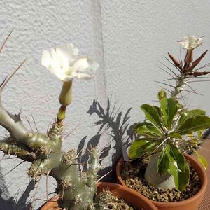 パキポディウムサンデルシー さらに開花💠中 うちで秋に咲くパキポはサンデルシーだけ。 この白い花💠がうれしい😊 昨晩から気温が下がり冷たい雨☔と強風🌀 夜の気温が下がるのはまあ良いんですが 昼間も気温が上がらないのは辛い😞 今年は寒くなるのかな~? まだ夏型塊根けっこう雨ざらししてるので😅