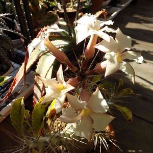 パキポディウムサンデルシー3号開花💠中 年内のパキポの💠花はこれが最後でしょう。 夜中は2℃だったが今は☀ポカポカ。 サンデルシーの交配は失敗のようです😓