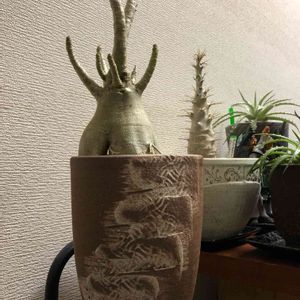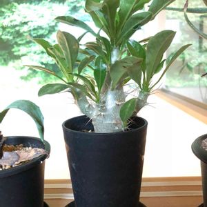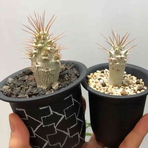 友人が実生より大事に大事に育ててきたパキポディウムを二つ、頂きました。 実生から徒長させずに育てるのは、本当に大変で難しい。 私が育てているパキポディウムは、全てその友人より頂いたもの。 大切に、だけど厳しく、締め上げて太く育てねば✨ 左: 実生より四年半育てているパキポディウム サンデルシー。 右: 実生より2年半のパキポディウム グラキリス。
