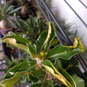 パキポディウムサンデルシーに💠花芽 葉っぱが茶色くなってるのが気になるなあ😅 去年は受粉失敗😞今年こそ一つでも結実を🙏 今朝は寒いな~と思ったら室温23℃、極端すぎる😓