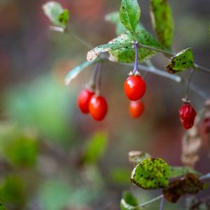 クコ(枸杞) ナス科クコ属の落葉低木 東南アジア原産 開花期は晩夏から秋(7 - 11月) 荒れ地などに見られ、夏から秋にかけて薄紫色の花を咲かせて、秋に赤い果実をつける。 この時期はまだみどり色。 有用植物で、食用や薬用に利用される。北アメリカなどにも移入され、分布を広げている。 別名、ウルフベリー、ゴジベリー。中国植物名は枸杞。