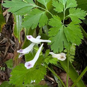 白い花の先だけ淡い紅紫色のシロヤブケマンの花が咲いていました♡🌿 北海道から九州の山麓等湿った所に生えています。 葉は根本と茎に付き2~3回羽状に細かく裂け裂片は更に深く切れ込んでいます。 ケシ科キケマン属
