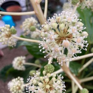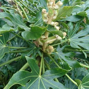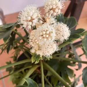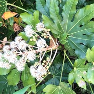 おはようございます🤗 白いかわいいお花が咲いていました💕 日陰に耐える事が出来る強健な性質。縁起木と親しまれ、葉が深く切れ込んでいる姿からヤツデ(八ツ手)天狗のうちわとも言われているようです、そして風水では葉の大きな植物は邪気が入るのを防いでくれる魔除けの植物といわれたようです🍀