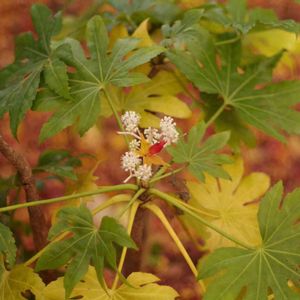先程とは別の神社の裏に ヤツデの花が咲いていました‼️ 奥にはモミジの紅葉が❗️