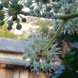 ヤツデの花‥花の少ない時期に咲くので蜜を目当てに虫たちが集まって来るが、あいにく今回は虫の姿見られず‥