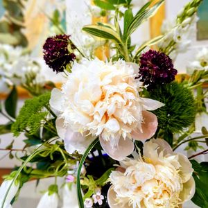 5月8日のフラワーアレンジメント 傷んだお花を入れ替えて リニューアルしました〜🩷 大輪のシャクヤク オーニソガラム,テマリソウ ルスカス 残ったお花は カンパニュラ,スカビオサ ユーカリ