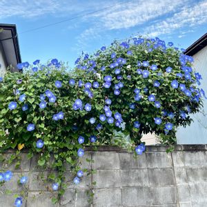 セイヨウアサガオ(西洋朝顔) ヘブンリーブルー ヒルガオ科 原産地 メキシコ 中央アメリカ 8月下旬から11月頃まで咲いています。 日本朝顔は午前中に萎んでしまいますが、ヘブンリーブルーは夕方まで咲いています。🌸 桜の花が終わったら家の中で種を水に浸して発芽させ、苗を育てました。霜が降りなくなったら地植えしました。🌱🌱 #グミの木🌳に絡まってしまいました。💦