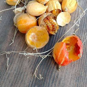 🍀今日のお花🍀 🔸カラスウリ🔸 🔸竹藪の中にオレンジ色のカラスウリを発見!鳥につつかれたようで、種が数個のみ残っていました。 🔸新発見! 秋から自然乾燥させていたカラスウリを開けてみました。🌽とうもろこしみたいに種がぎっしり!