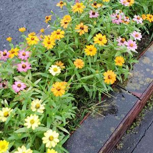 雨に打たれて咲くジニア。仲良くおしゃべりしているみたい。