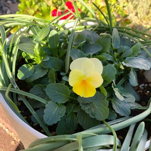 種から育てたビオラひよこももかが開花しました。可愛い黄色💕 まわりのムスカリの葉がモサモサしてますが、、、 3株植えたので、次々開花してくれるといいな