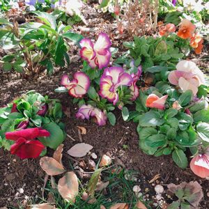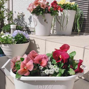 中央は購入苗の虹色スミレです。 左の赤っぽいパンジーと、右のくすみピンクっぽいパンジーと右奥のアプリコット色のパンジーは、全て同じ品種のパンジーみやびキューティーアプリコットです。色幅があって、本当に面白い品種です。種から育てて、もうすぐ半年。かわいい我が子です☺️