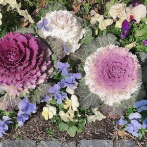 葉牡丹の周りのビオラたちが開花が進み、玄関前の花壇が明るくなって、とても嬉しいです😊
